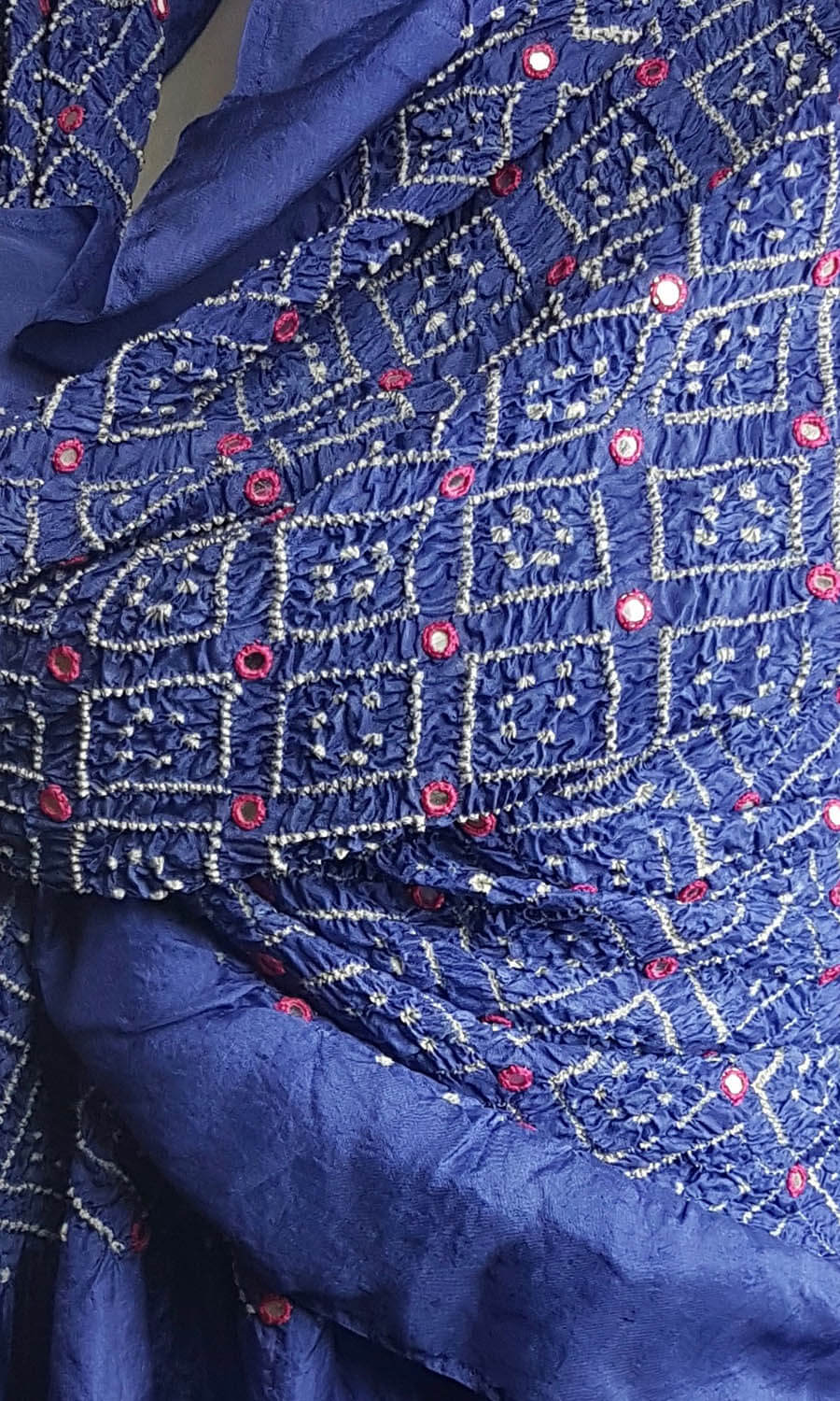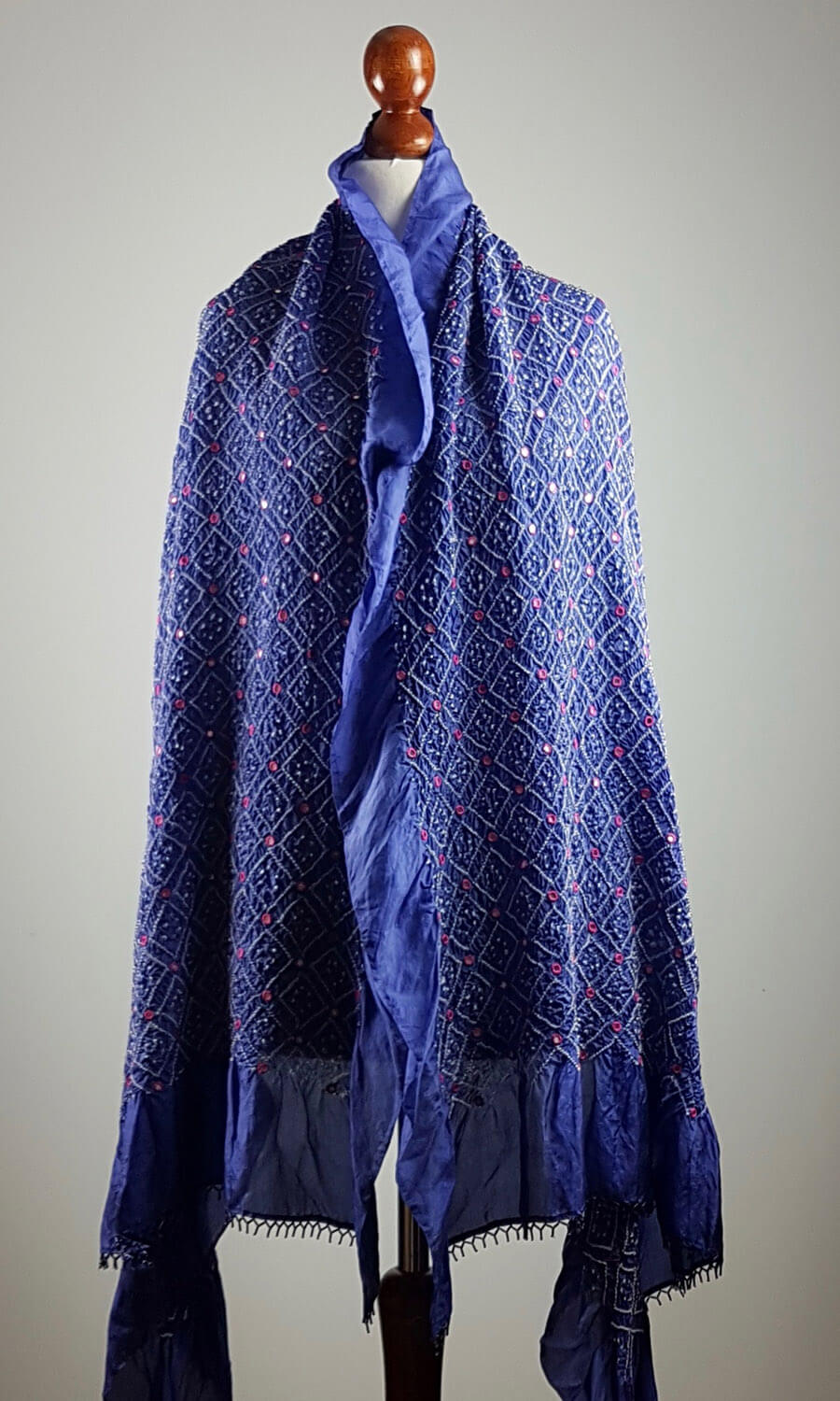 Dieses hochqualifizierte Kunsthandwerk kommt vor allem aus dem Gujarat (Indien). Der Schal wird hierbei erst abgebunden und dann von Hand mit Naturfarben eingefärbt. Es ist eine sehr feine und besondere Technik, bei der die Seide mit den Fingern so abgebunden wird, dass beim Färben kleine Punkte entstehen. Dieses Vorgehen lässt ein einzigartiges und besonderes Muster im Schal entstehen. Durch die akklimatisierende Eigenschaft der Seide und das leichte Gewicht, ist dieser Schal wahnsinnig angenehm auf der Haut.
