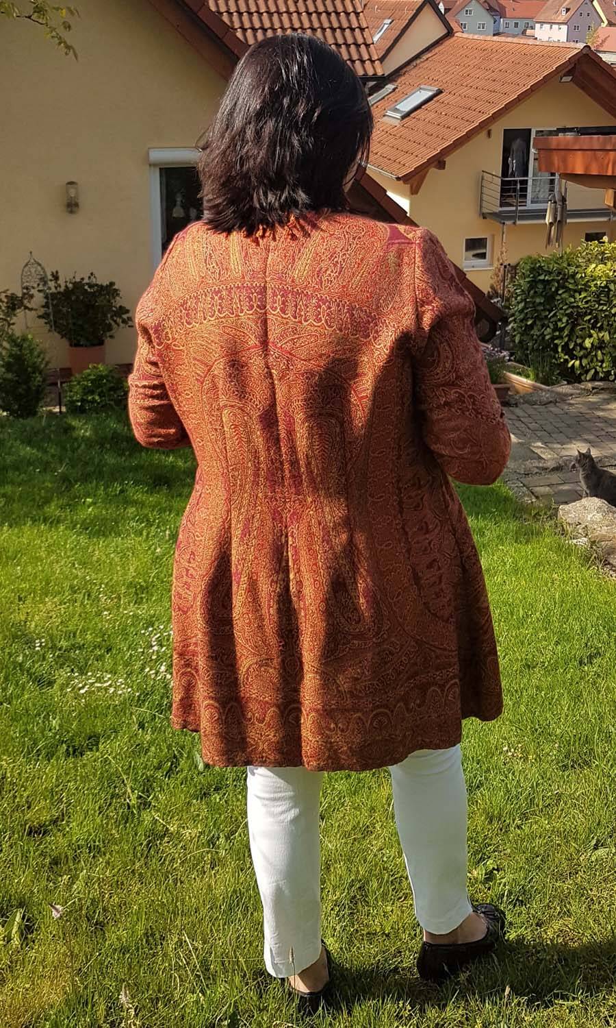 Schnitt: | lockerer Schnitt, von vorne gleicht er einer Jacke, von hinten einem Gehrock |