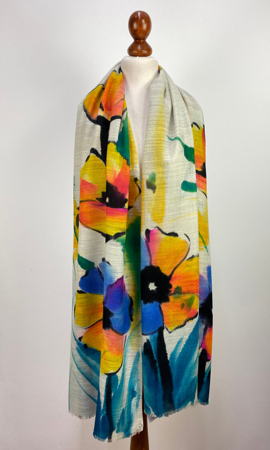 Hochwertig gefertigter Schal aus feiner Merinowolle mit floralen Muster.