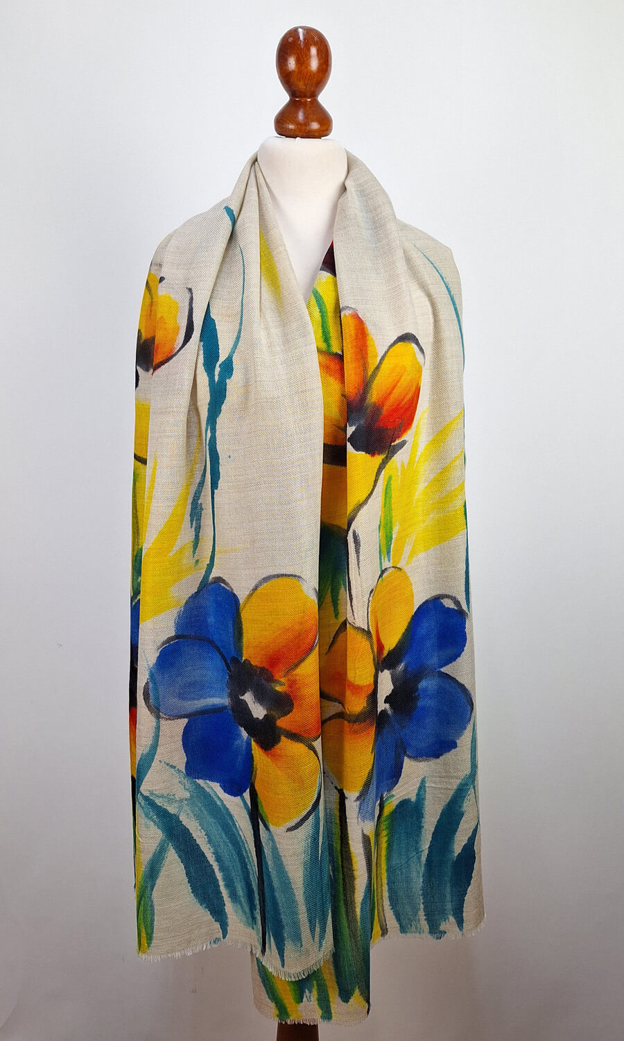 Hochwertig gefertigter Schal aus feiner Merinowolle mit floralen Muster.