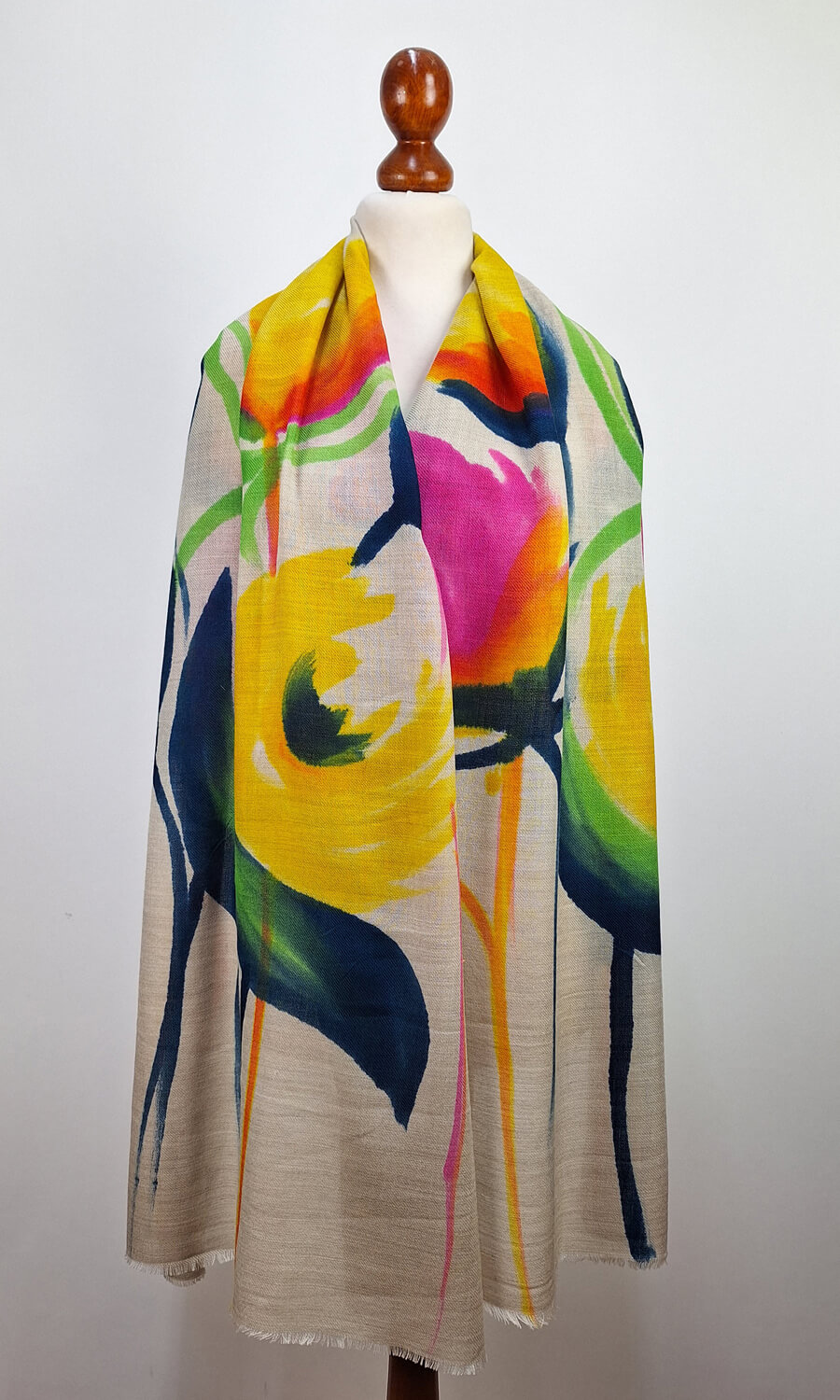 Hochwertig gefertigter Schal aus feiner Merinowolle mit floralen Muster.