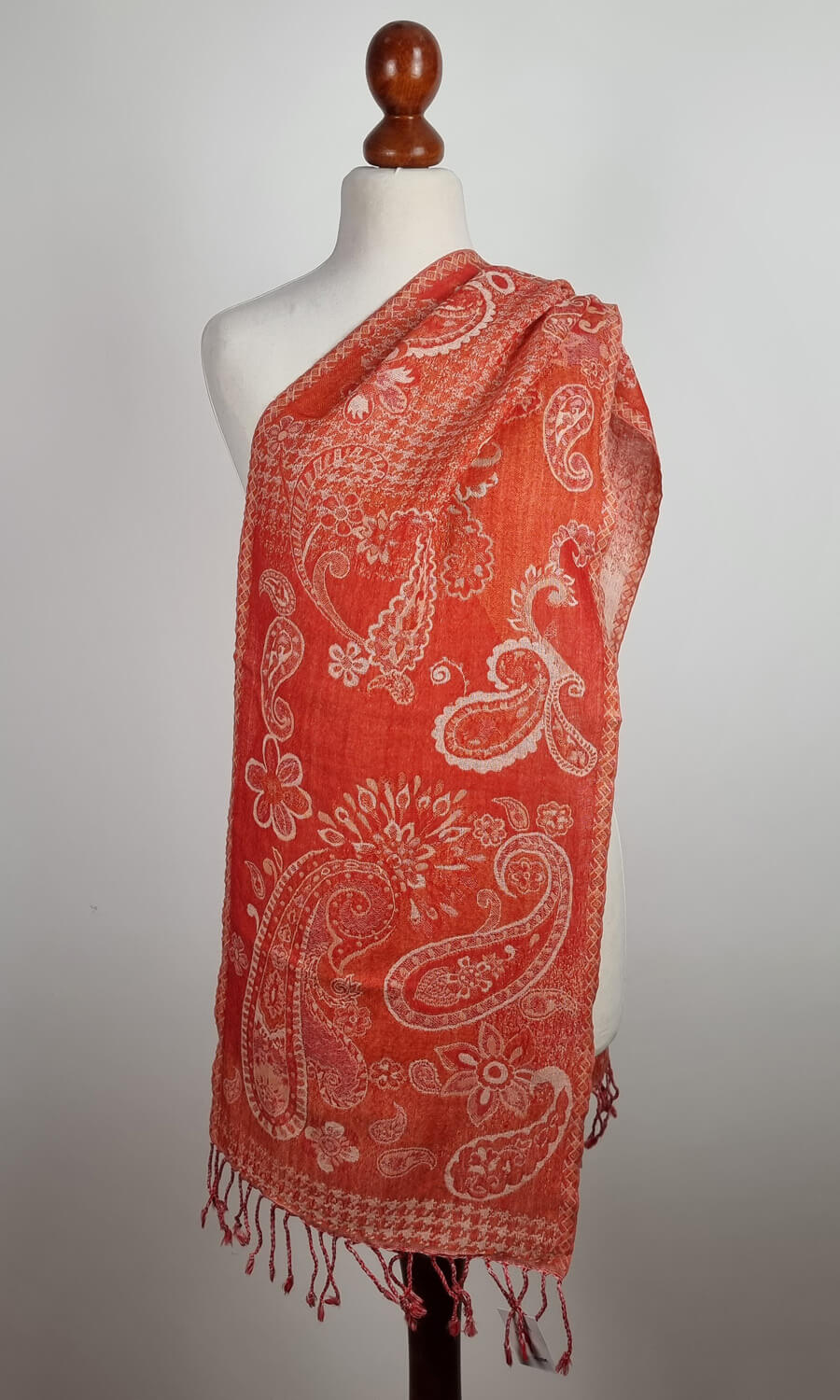 Dieser wunderschöne Schal wurde in einem kleinen Betrieb in der Region Kaschmir (Indien) gefertigt  und ist eine limitierte Kollektion. Mit seiner Größe von ca. 35 cm x 160 cm lässt er sich vielseitig binden und ist für das perfekte Accessoire für eine Jacke, Pullover oder Bluse. Durch seine doppelte Webung hat der Schal zwei unterschiedliche Seiten, die sich in der Farbgebung leicht voneinander unterscheiden. Mit einem Gewicht von nur ca. 140g ist er federleicht an deinem Hals und schenkt dir wohlige Wärme.