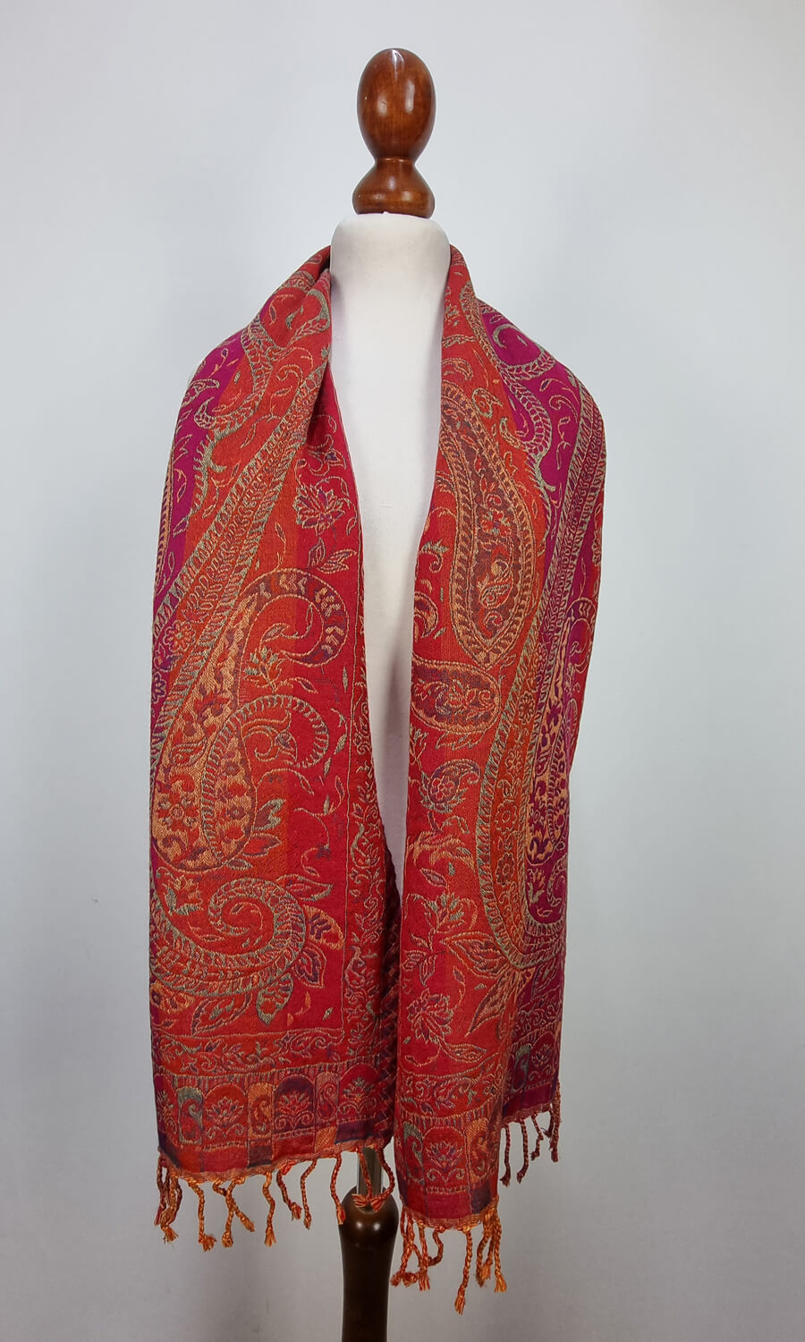 Dieser wunderschöne Schal wurde in einem kleinen Betrieb in der Region Kaschmir (Indien) gefertigt und ist eine limitierte Kollektion. Mit seiner Größe von ca. 35 cm x 160 cm lässt er sich vielseitig binden und ist für das perfekte Accessoire für eine Jacke, Pullover oder Bluse. Durch seine doppelte Webung hat der Schal zwei unterschiedliche Seiten, die sich in der Farbgebung leicht voneinander unterscheiden. Mit einem Gewicht von nur ca. 140g ist er federleicht an deinem Hals und schenkt dir wohlige Wärme.