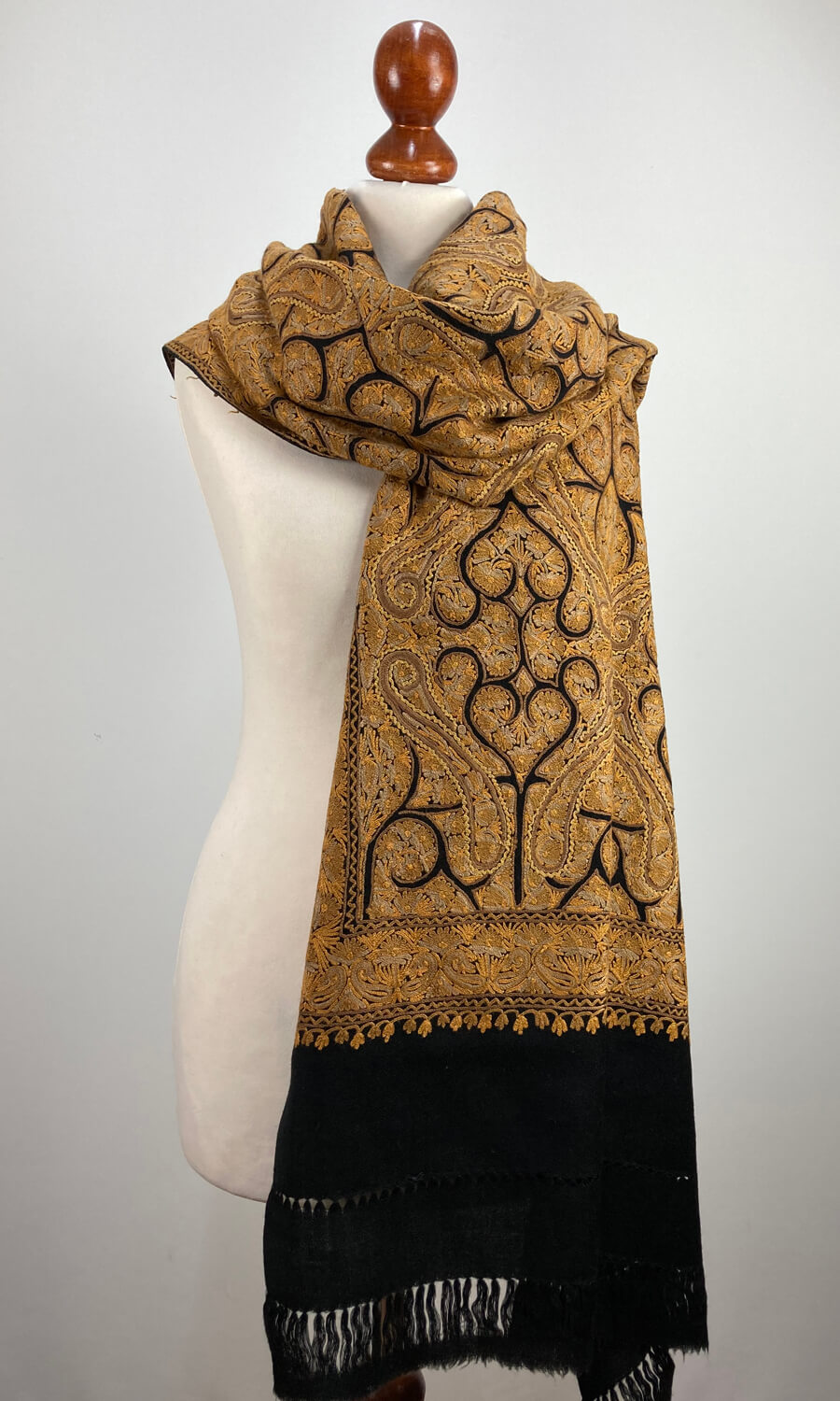 Er wurde in einem kleinen Atelier in der Region Kaschmir (Indien) gefertigt und ist somit streng limitiert. Mit seiner Größe von ca. 70cm x 200cm lässt er sich vielseitig binden und ist daher bestens als Schultertuch geeignet. Der Schal ist in einem wunderschönen, Muster bestickt und somit ein absoluter Eye- Catcher. Mit einem Gewicht von nur ca. 250g ist er federleicht und schenkt dir wohlige Wärme.
