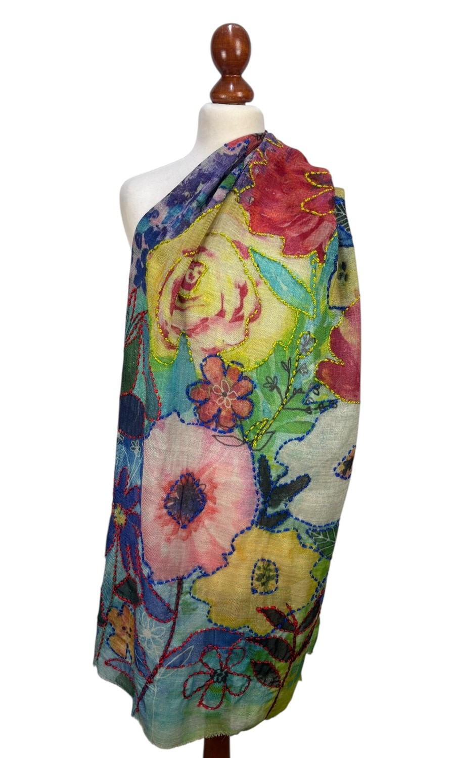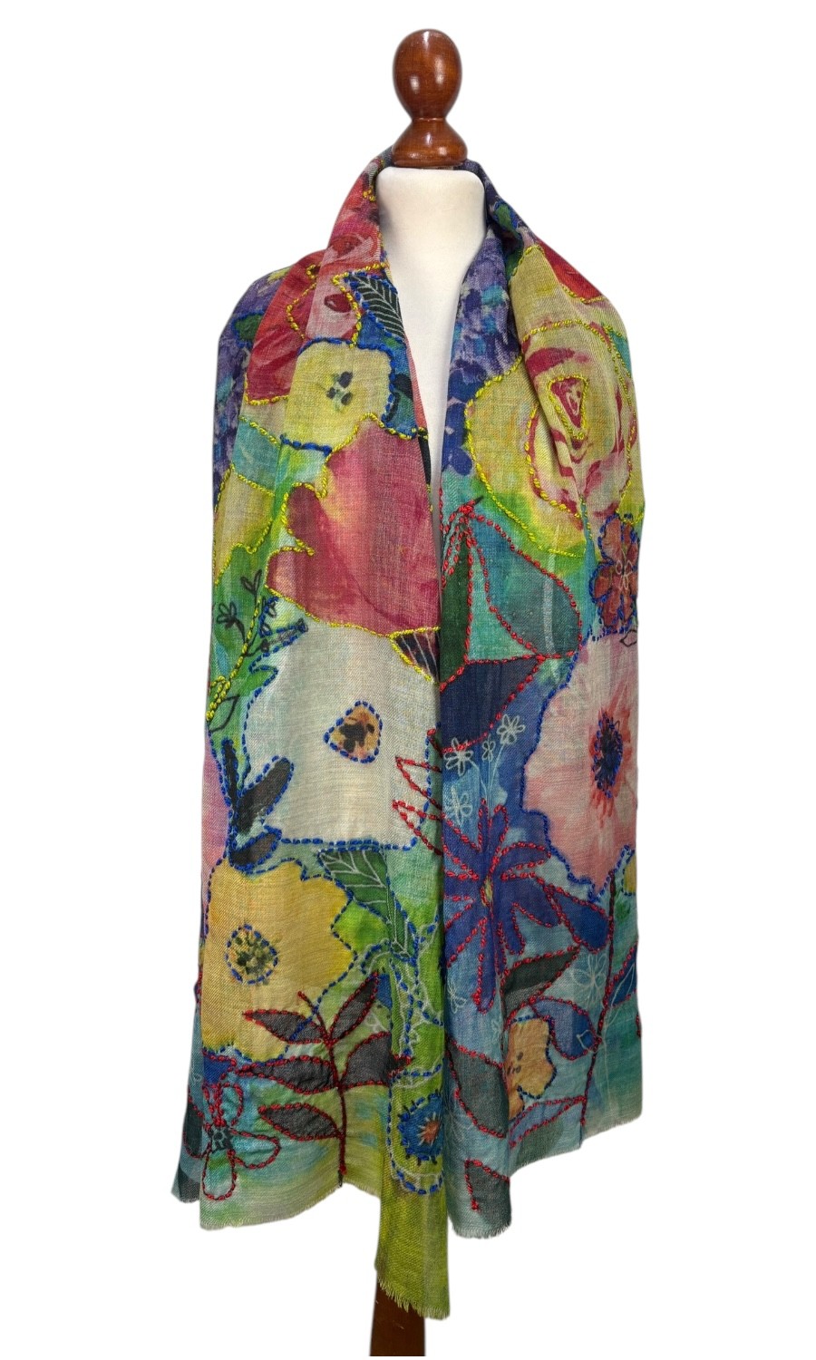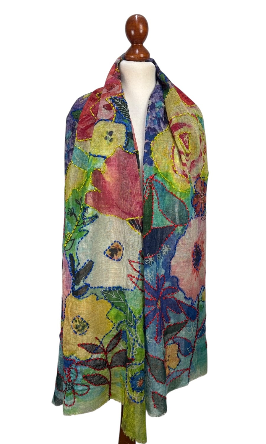 Stilvoller, bemalter Schal aus feiner Merinowolle.