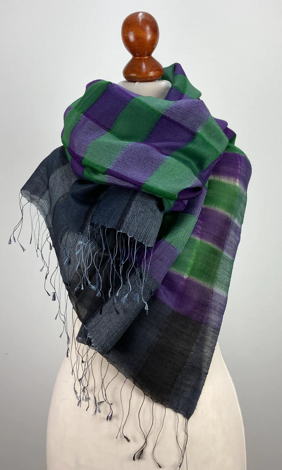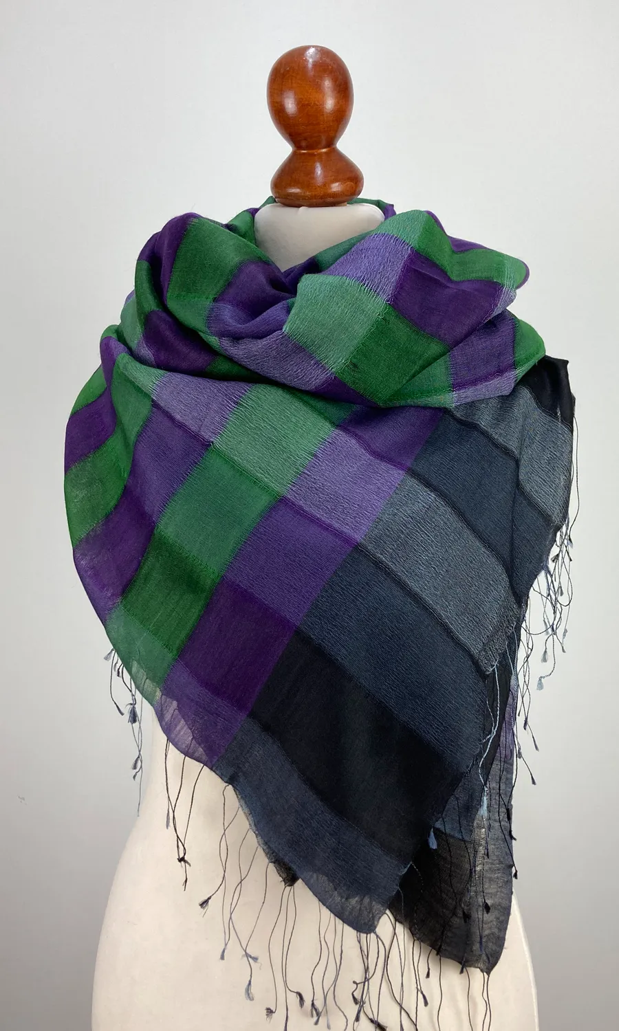 Gönn dir ein Stück Luxus mit diesem wunderschönen Schal aus 100 % reiner Seide. Mit seinem edlen Karomuster in Grün und Violett verleiht er jedem Outfit das gewisse Etwas – ob lässig über die Schultern gelegt oder elegant als Halstuch getragen.