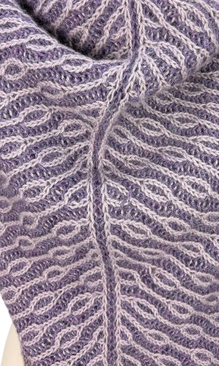 Sanft wie ein Hauch Lavendel und zugleich ausdrucksstark im Detail: Dieses handgestrickte Dreieckstuch aus 100% Alpakawolle ist ein echtes Meisterstück. In der Briochetechnik gestrickt, erhält das Tuch eine einzigartige, plastische Struktur, die es sehr besonders, voluminös und wärmend macht. Die doppelte Strickweise sorgt für ein einzigartiges Griffgefühl und lässt die sanften Lavendeltöne noch intensiver zur Geltung kommen. Mit einer wunderbaren Größe von 280cm x 60cm lässt sich das Tuch vielseitig stylen: als eleganter Schulterwärmer, lässig um den Hals geschlungen oder kunstvoll drapiert. Mit seinem angenehmen Gewicht von 300g bleibt es anschmiegsam und komfortabel – ideal für stilvolle Akzente an kühlen Tagen oder als treuer Begleiter durch das ganze Jahr.