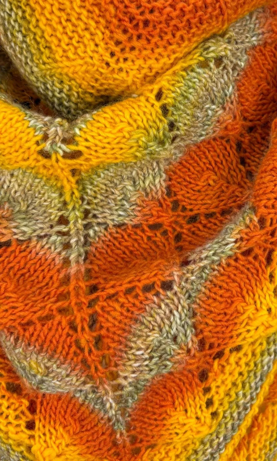 Handgestricktes Dreieckstuch – Farbenspiel in Grün, Gelb & Orange