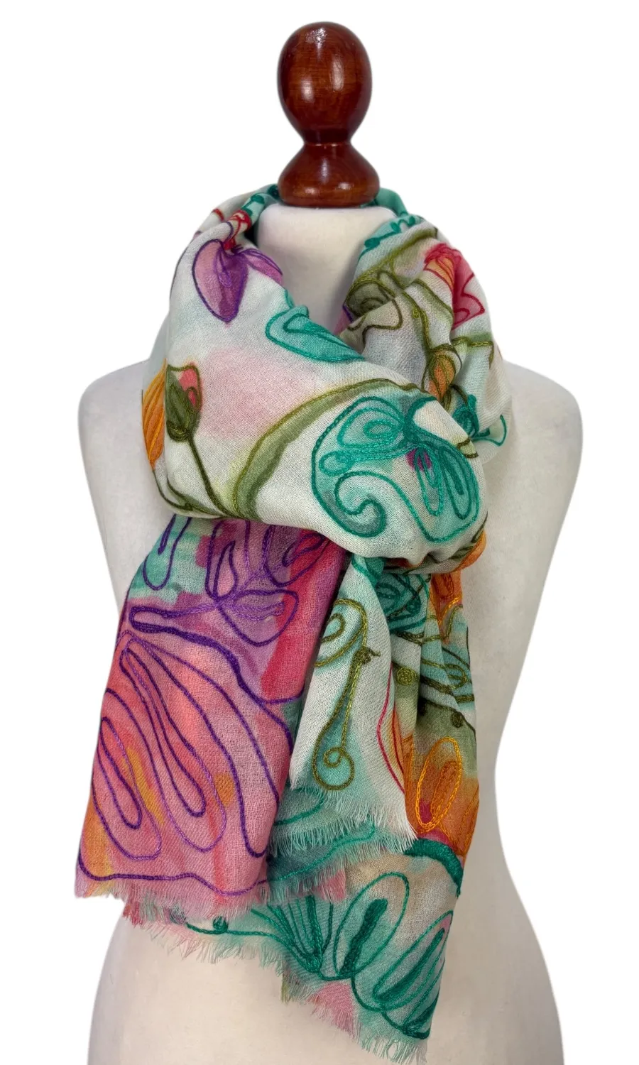 Stilvoller, bemalter Schal aus feiner Merinowolle.