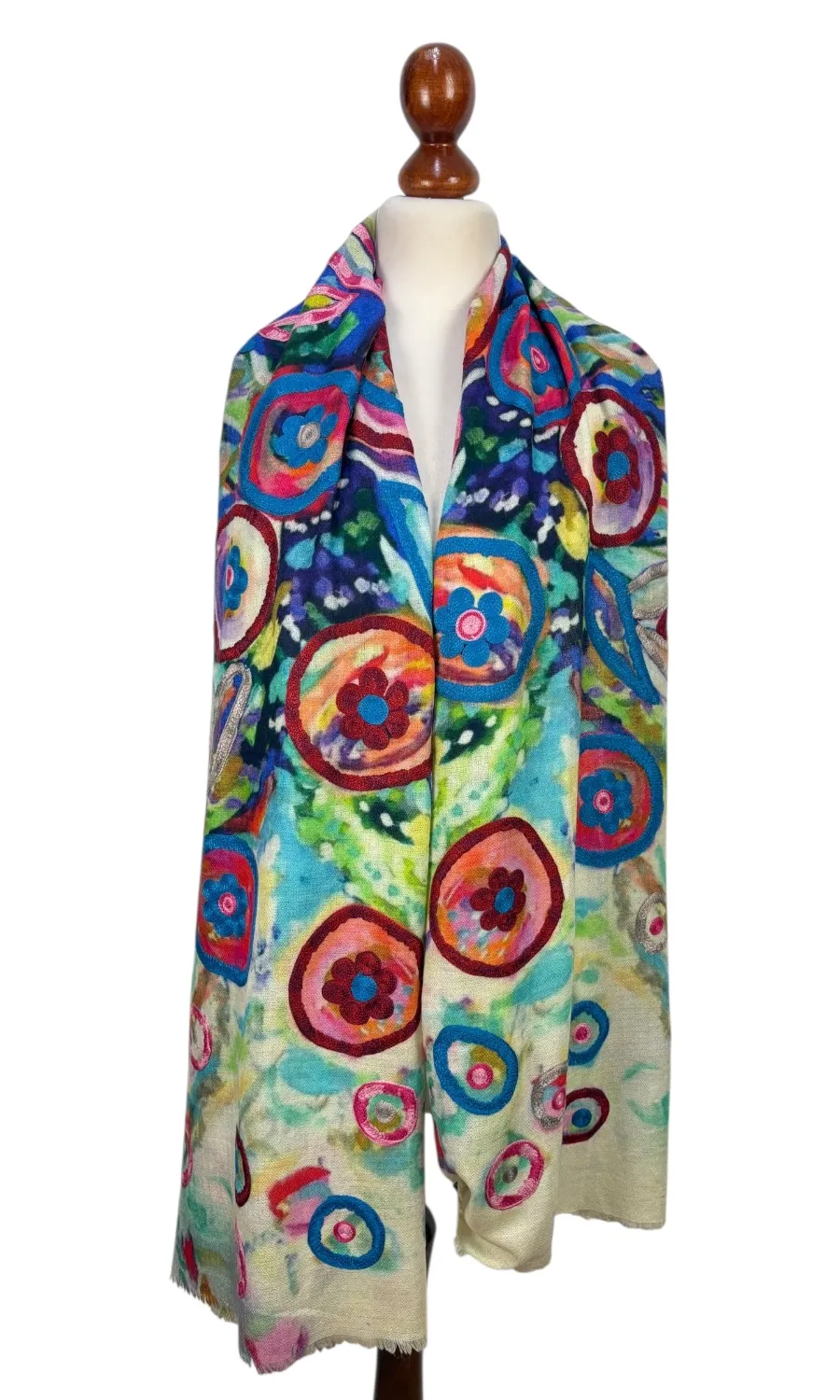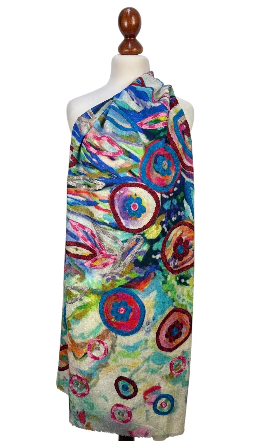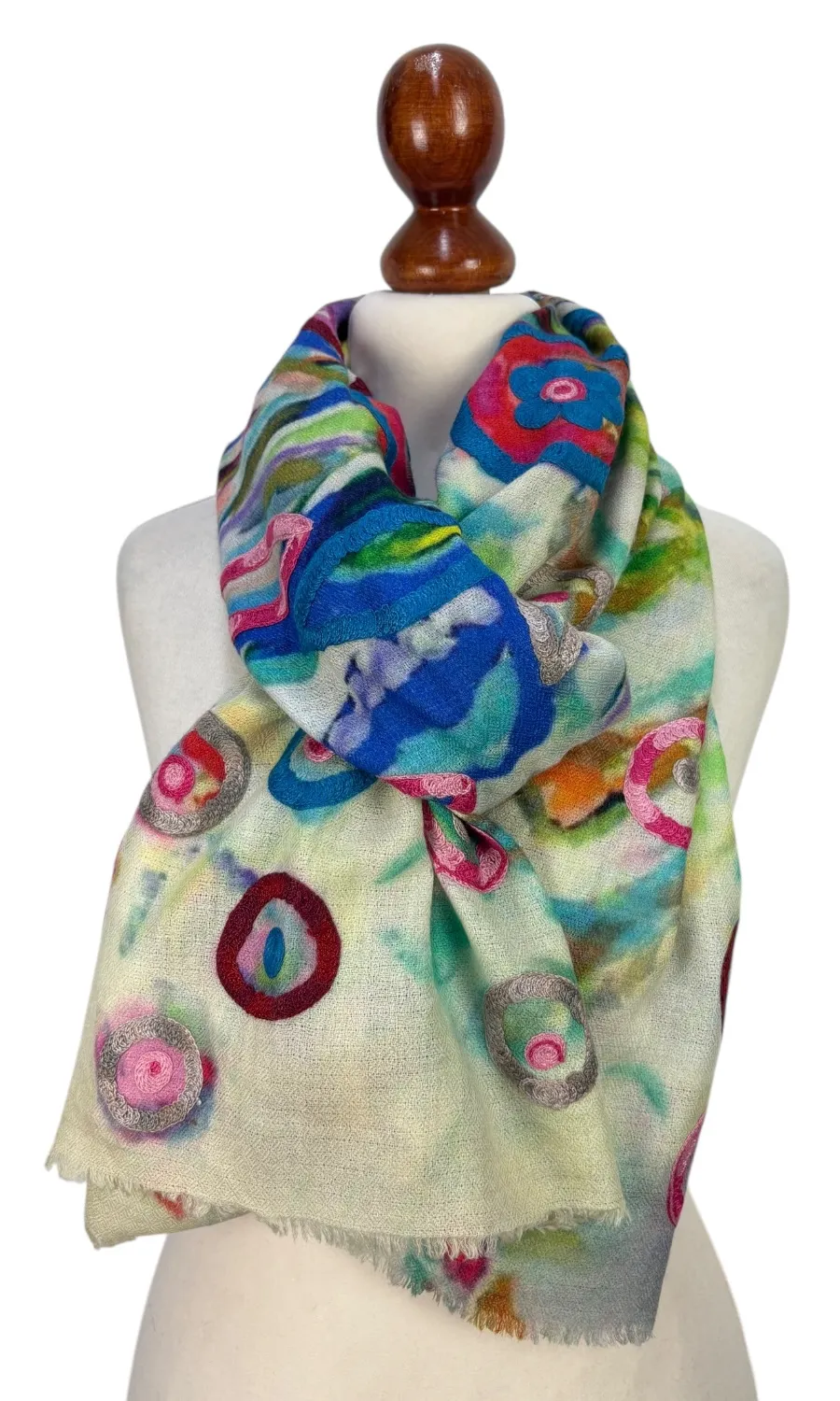 Stilvoller, bemalter Schal aus feiner Merinowolle.