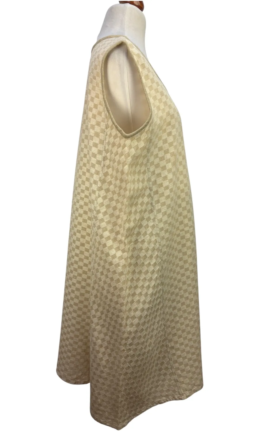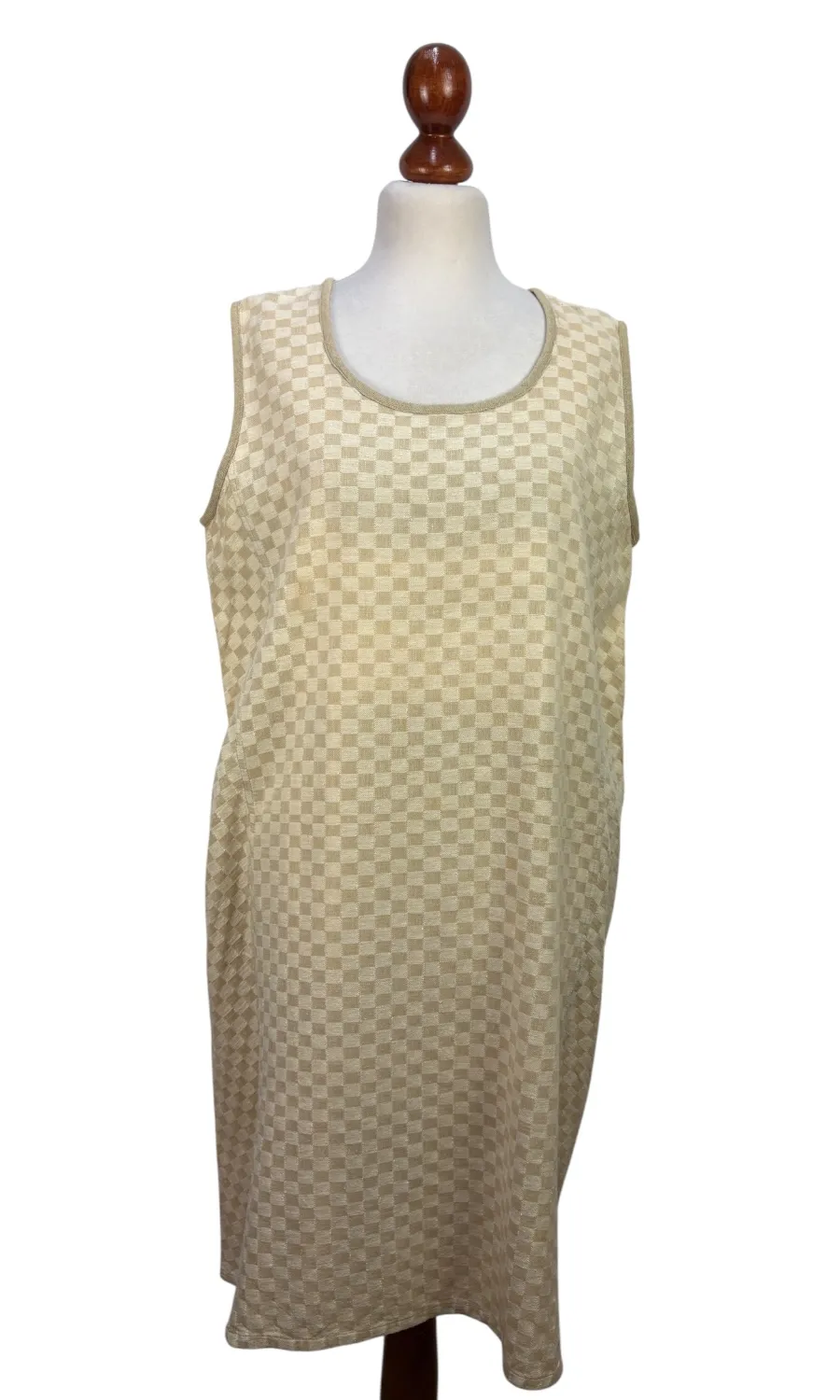 Dieses stilvolle Midikleid begeistert durch seine klare Linie, das dezente Karomuster und den angenehm fließenden Stoff. Der ärmellose Schnitt mit rundem Ausschnitt verleiht dem Kleid eine moderne Leichtigkeit, die perfekt für warme Tage ist. Die schmeichelnde A-Linie sorgt für eine bequeme Passform ohne einzuengen – ideal für Frauen, die Wert auf Komfort und Klasse legen. Der zurückhaltende Beigeton lässt sich wunderbar kombinieren, ob mit Sandalen, einem leichten Cardigan oder einem eleganten Tuch. Ein vielseitiges Kleid für Alltag, Urlaub oder sommerliche Anlässe – schlicht, feminin und zeitlos schön.