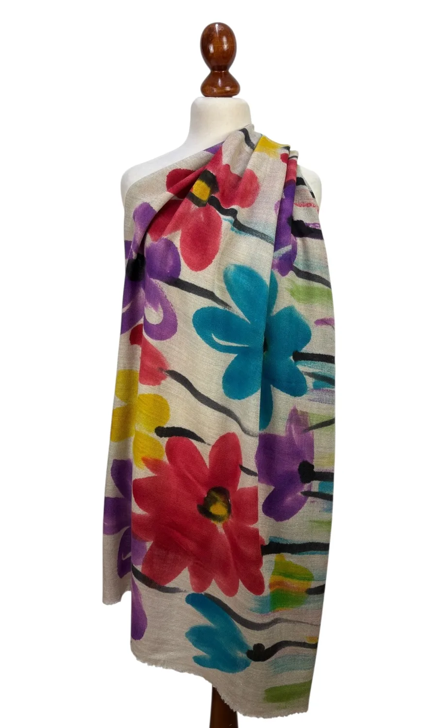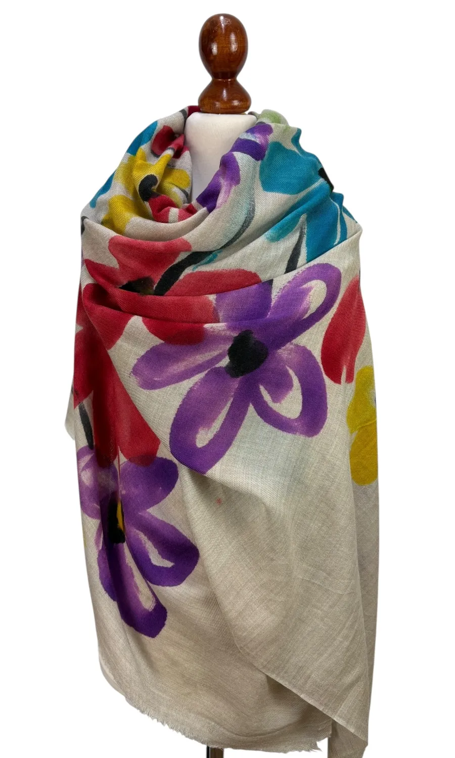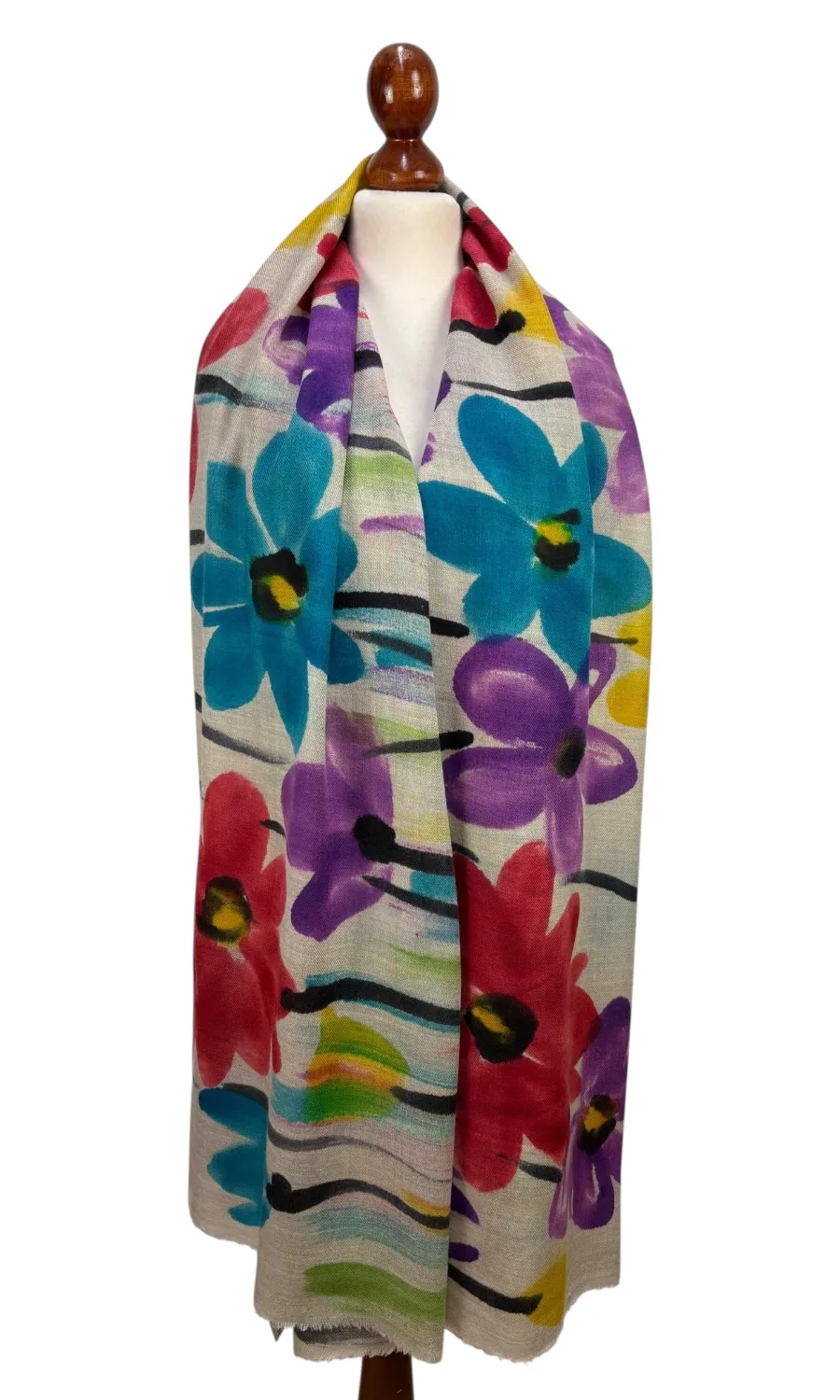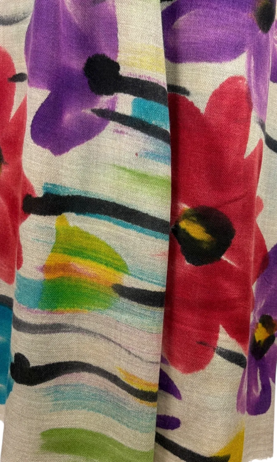Hochwertig gefertigter Schal aus feiner Merinowolle mit floralen Muster.