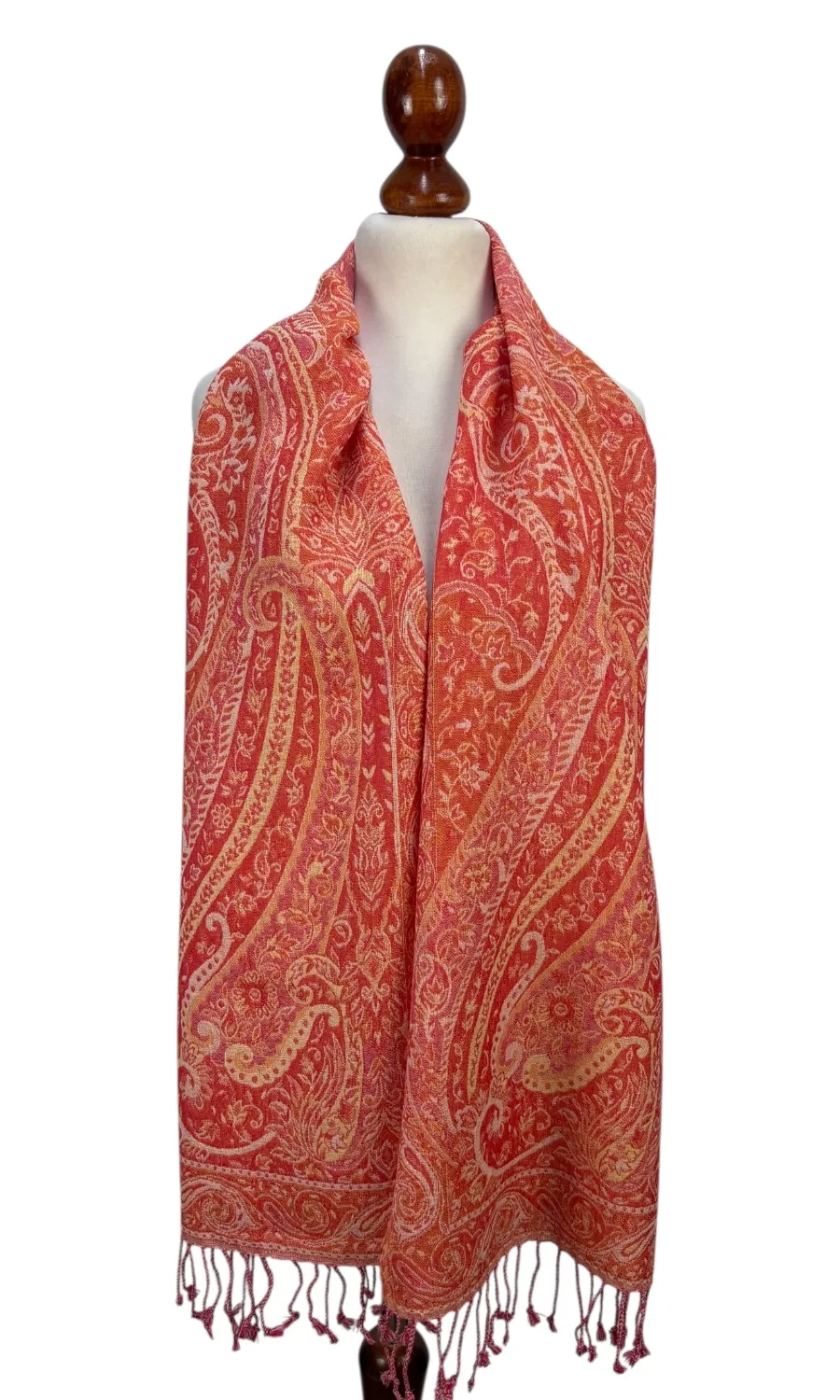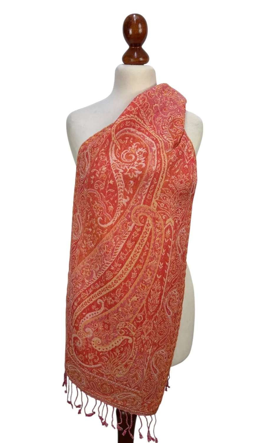 Dieser wunderschöne Schal wurde in einem kleinen Betrieb in der Region Kaschmir (Indien) gefertigt und ist eine limitierte Kollektion. Mit seiner Größe von ca. 35 cm x 160 cm lässt er sich vielseitig binden und ist für das perfekte Accessoire für eine Jacke, Pullover oder Bluse. Durch seine doppelte Webung hat der Schal zwei unterschiedliche Seiten, die sich in der Farbgebung leicht voneinander unterscheiden. Mit einem Gewicht von nur ca. 140g ist er federleicht an deinem Hals und schenkt dir wohlige Wärme.