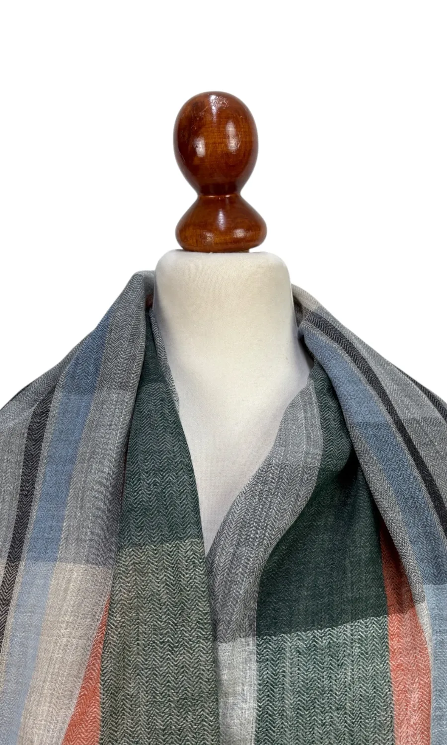 Dieser Schal wurde in Indien in einer kleinen Firma hergestellt und ist somit eine limitierte Besonderheit. Mit seiner Größe von 70cm x 200cm ist er bestens geeignet, um ihn vielseitig zu binden und zu tragen. Die feine Wolle ist hervorragend für kühlere Tage - auch an lauen Sommerabenden dient der Schal als Jackenersatz, großflächig um die Schultern getragen. Mit einem Gewicht von nur 110g ist er der perfekte Begleiter im Alltag und verzaubert mit seinem klassisch eleganten Design.