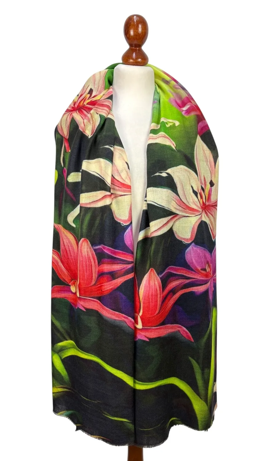 Hochwertig gefertigter Schal aus feiner Merinowolle mit floralen Muster.
