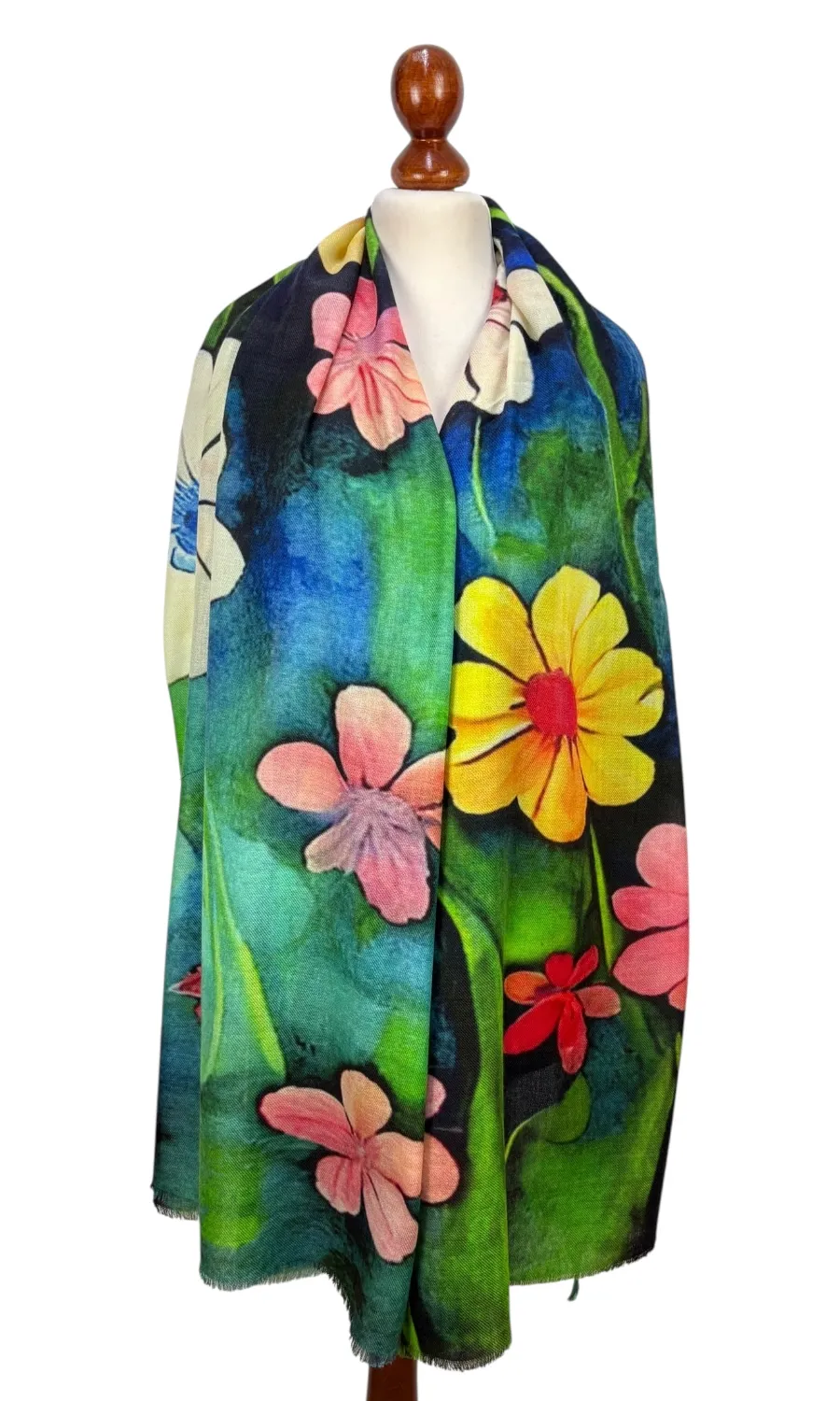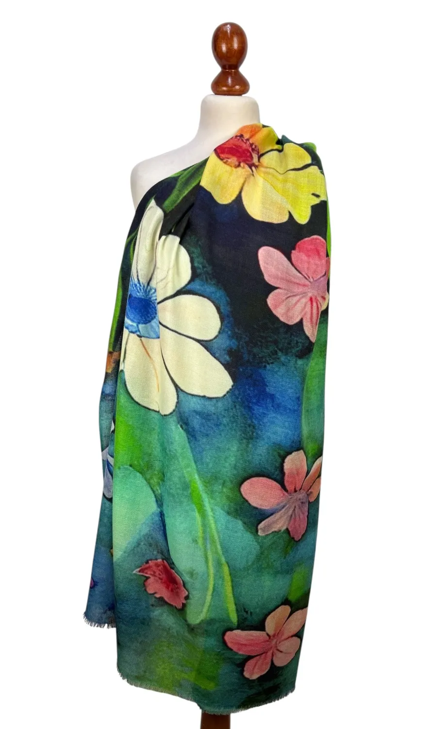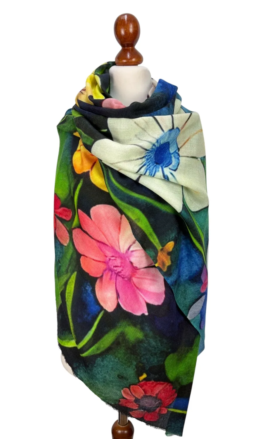 Hochwertig gefertigter Schal aus feiner Merinowolle mit floralen Muster.