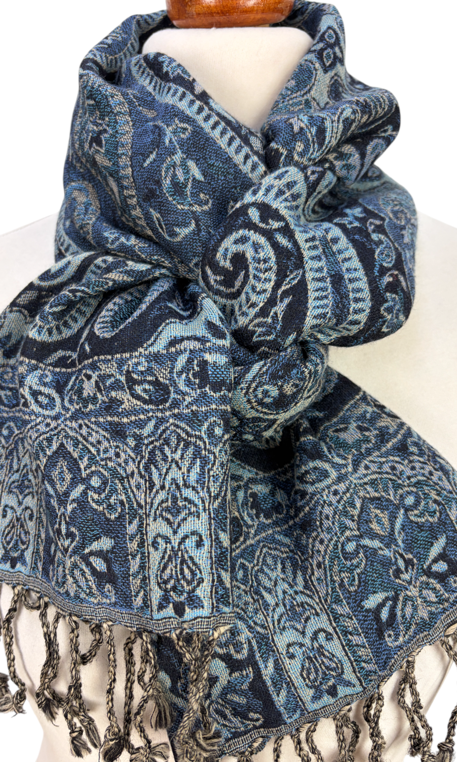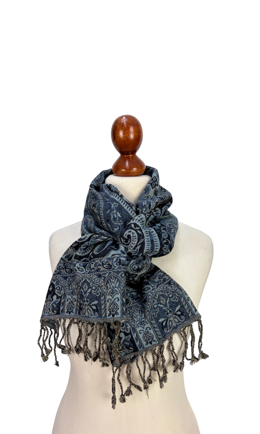 Dieser wunderschöne Schal wurde in einem kleinen Betrieb in der Region Kaschmir (Indien) gefertigt und ist eine limitierte Kollektion. Mit seiner Größe von ca. 35 cm x 160 cm lässt er sich vielseitig binden und ist für das perfekte Accessoire für eine Jacke, Pullover oder Bluse. Durch seine doppelte Webung hat der Schal zwei unterschiedliche Seiten, die sich in der Farbgebung leicht voneinander unterscheiden. Mit einem Gewicht von nur ca. 140g ist er federleicht an deinem Hals und schenkt dir wohlige Wärme.