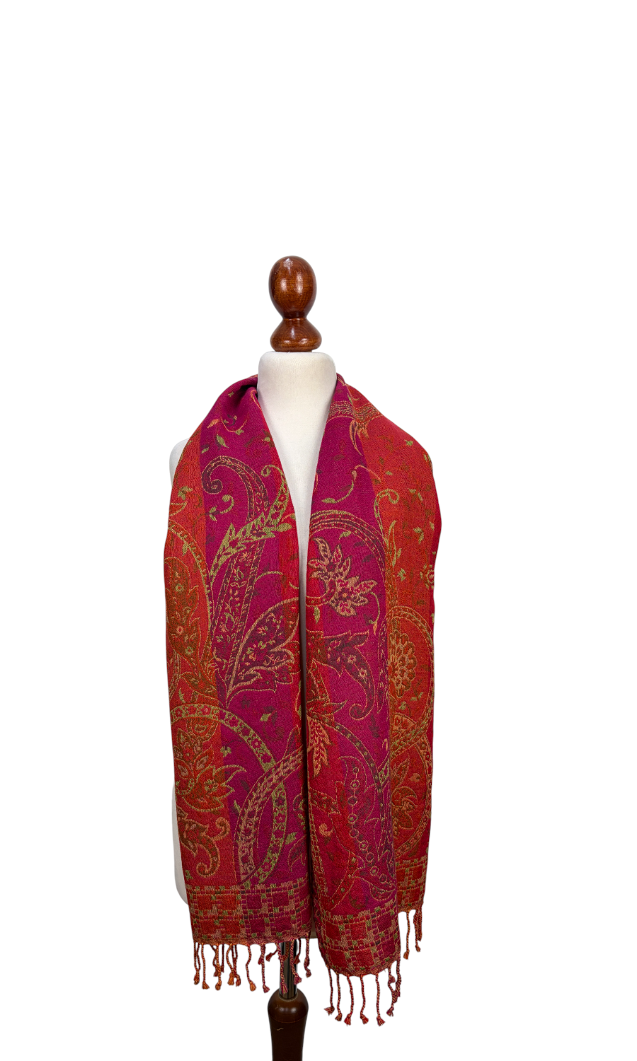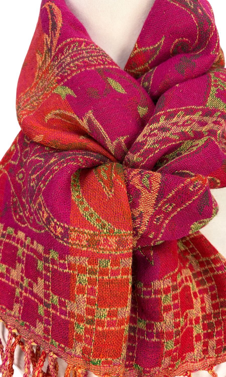 Dieser wunderschöne Schal wurde in einem kleinen Betrieb in der Region Kaschmir (Indien) gefertigt und ist eine limitierte Kollektion. Mit seiner Größe von ca. 35 cm x 160 cm lässt er sich vielseitig binden und ist für das perfekte Accessoire für eine Jacke, Pullover oder Bluse. Durch seine doppelte Webung hat der Schal zwei unterschiedliche Seiten, die sich in der Farbgebung leicht voneinander unterscheiden. Mit einem Gewicht von nur ca. 140g ist er federleicht an deinem Hals und schenkt dir wohlige Wärme.