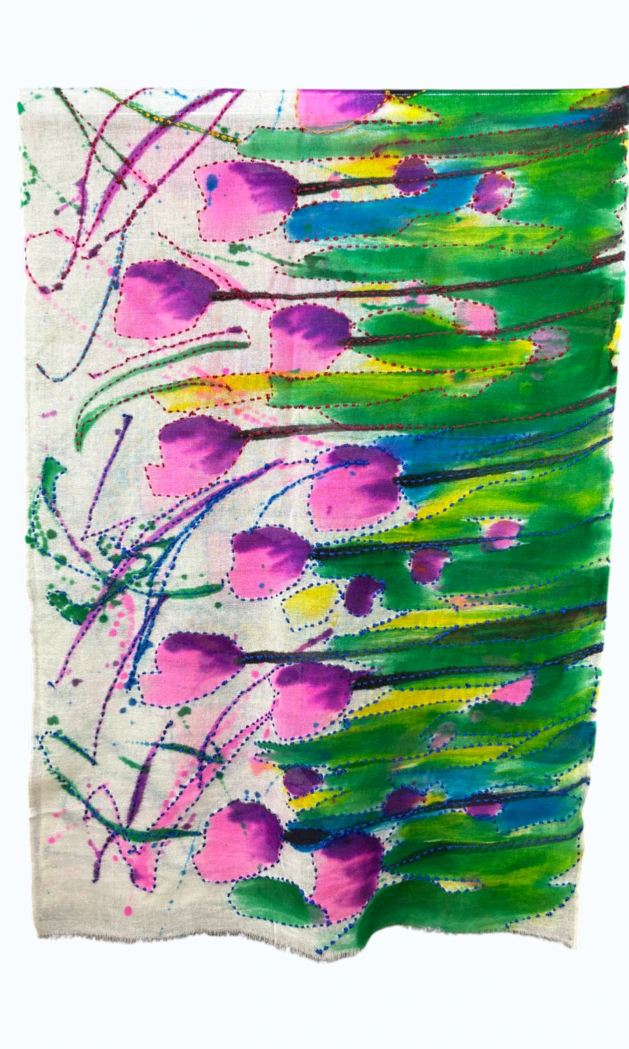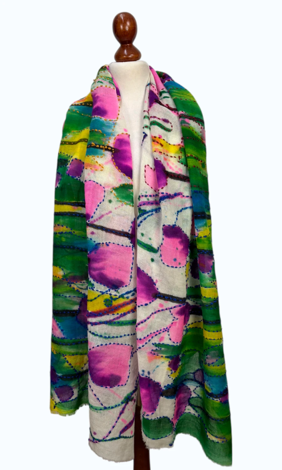 Stilvoller, bemalter Schal aus feiner Merinowolle.
