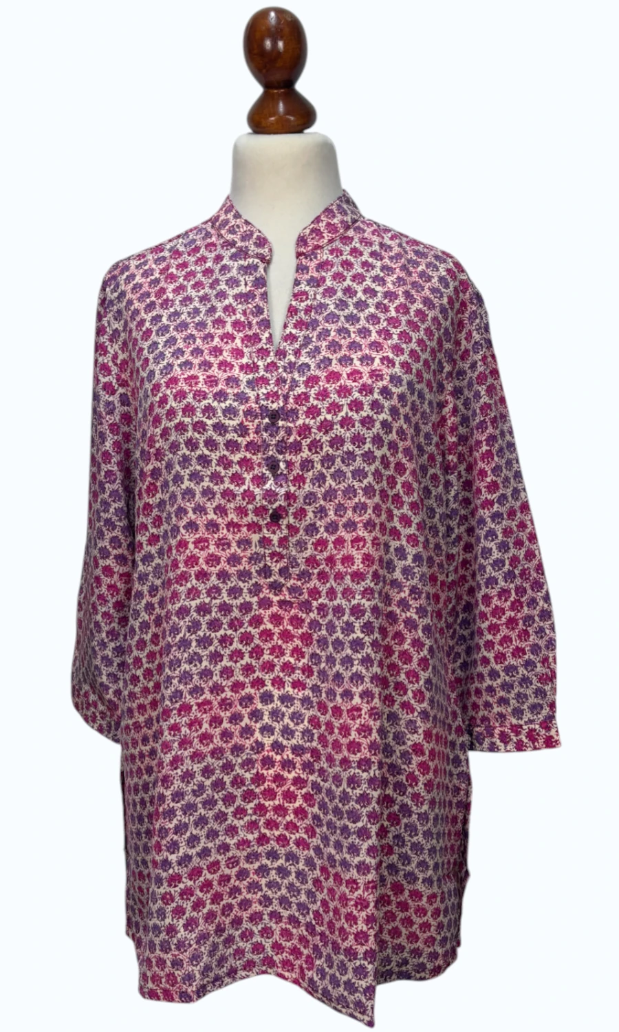 Diese wunderschöne Bluse wurde in einem kleinen, traditionellen Atelier in Indien gefertigt und ist ein wahrer Blickfang für deine Garderobe. Jede einzelne Bluse ist streng limitiert und mit diesem zeitlos eleganten Muster bedruckt. Hergestellt aus hochwertiger Seide, bietet diese Bluse ein außergewöhnlich zartes und angenehmes Tragegefühl. Die Seide umschmeichelt deine Haut und verleiht dir ein luxuriöses Gefühl, das dich den ganzen Tag über begleitet.