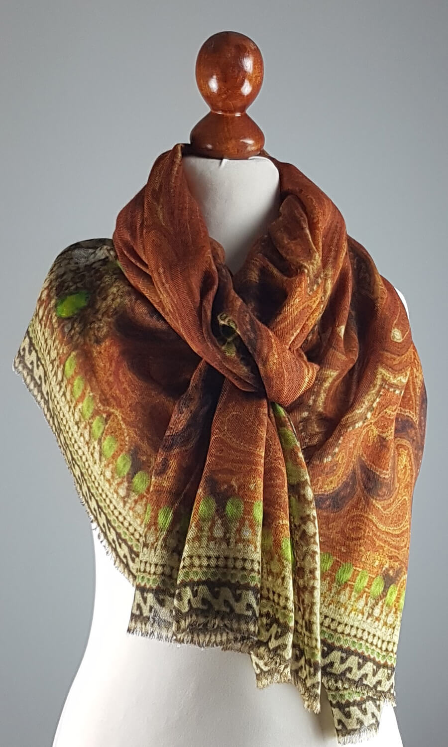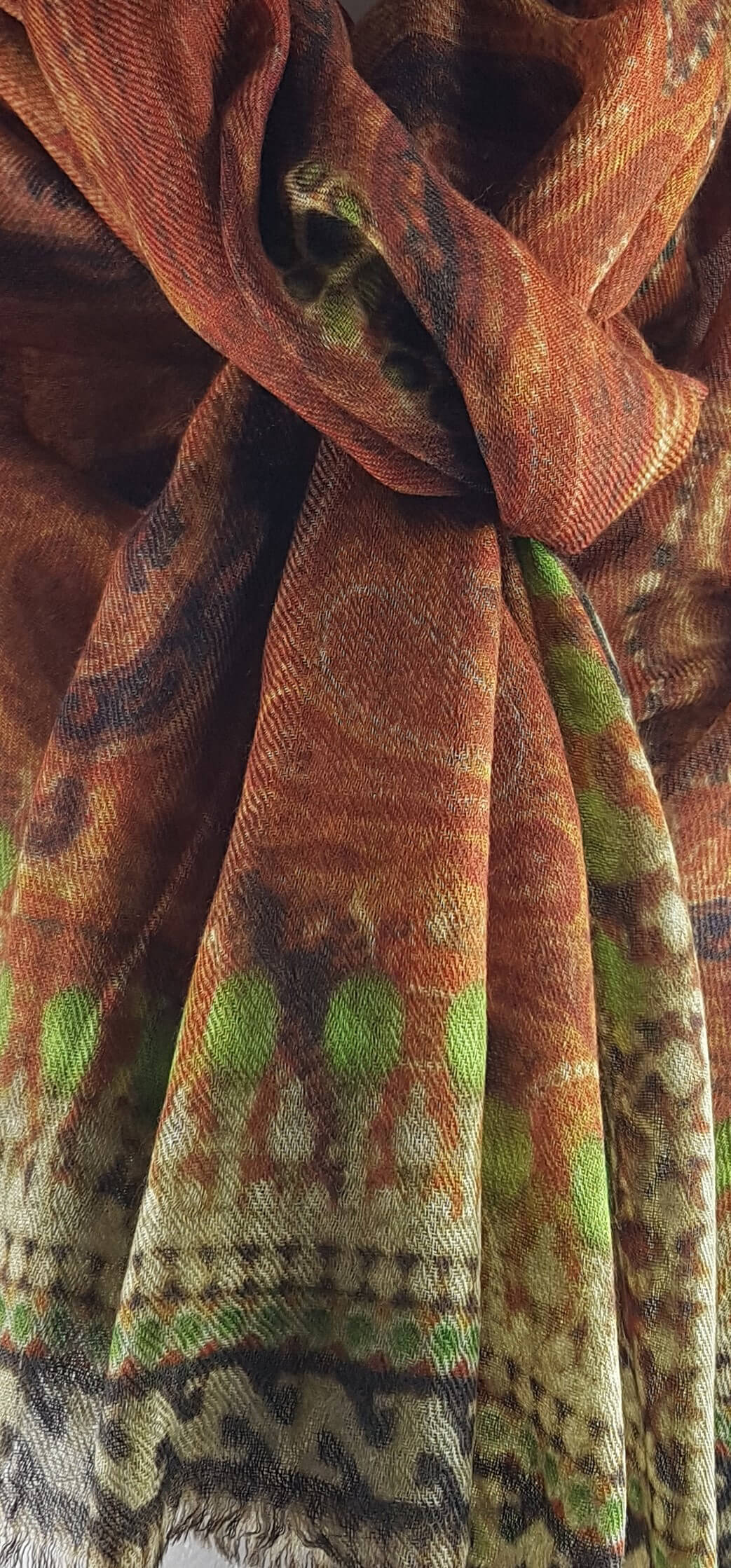 Er wurde in einem kleinen Atelier in der Region Kaschmir (Indien) gefertigt und ist somit streng limitiert. Mit seiner Größe von ca. 70 cm x 200 cm lässt er sich vielseitig binden und ist daher  bestens als Schultertuch geeignet. Der Schal ist in einem Mix aus modernen und klassischen Mustern bedruckt und somit der ideale Begleiter für jeden Anlass. Mit einem Gewicht von nur ca. 140g ist er federleicht und schenkt dir wohlige Wärme.